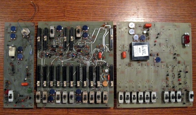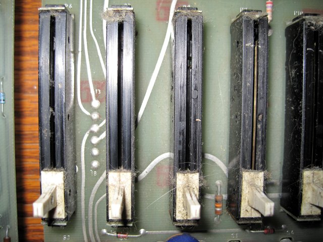 While looking at the circuit boards of both units, it became apparent that the faders would need serious cleaning, or replacement. They were all caked with decades of dust, hair, and food. Click on the photo to see a closeup of the gunk.