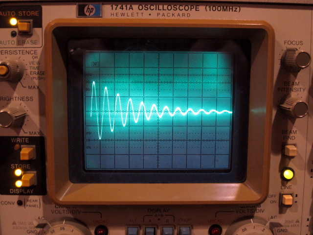 This is an oscilloscope trace of the bass drum output, after I made my changes. I have the vertical sweep set to 20 ms/div. The total decay is about 10 divisions long, or about 200 ms.