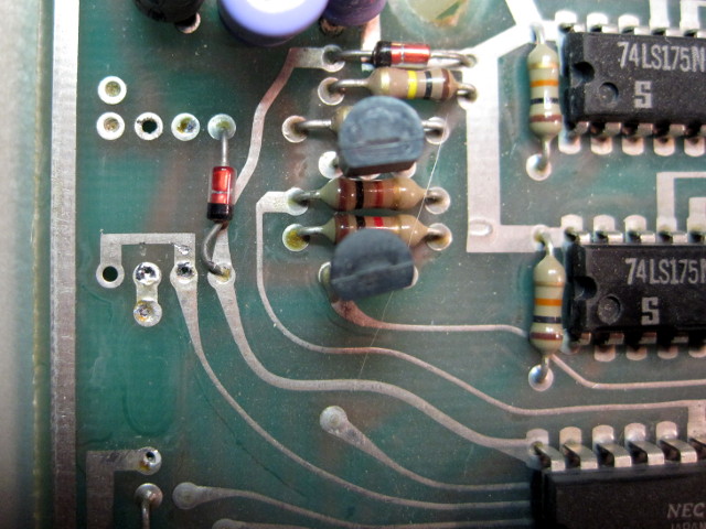 While poking around the inside of the CR-78, I noticed some solder bridges on the PCB. This doesn't look good! Since the patina of the bridges looked the same as other solder elsewhere on the board, I concluded that this was probably a manufacturing defect.