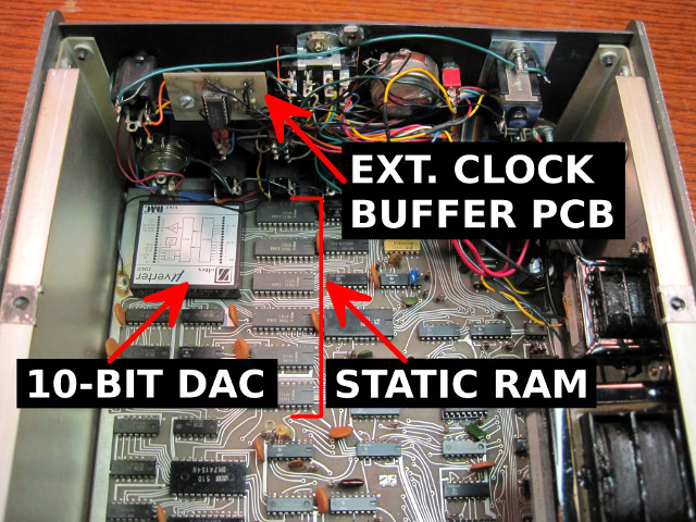 The external clock-in jack on the Model-800 will accept a typical 5V peak clock signal, as well as a line-level audio clock source. This allows you to syncronize via tape sync. To handle the level differences between 5V peak, and the output of a tape deck, there is an additional small PCB on early models. It acts as a buffer and level adjuster. On later versions of the Model-800, it is built onto the main circuit board.